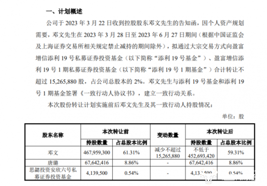 截至2023 年 3 月 28 日至 4 月 7 日,邓文通过大宗交易方式向添利 19 号基金及添利 19 号 1 期基金共计转让 15,250,000 股,占公司总股本的 2.00%。