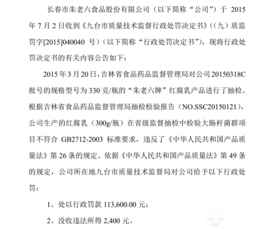 值得注意的是,公司曾因为生产的腐乳里的验大肠杆菌群项检验不合格,受到吉林省九台市质量技术监督局的行政处罚,被罚11.36万元。