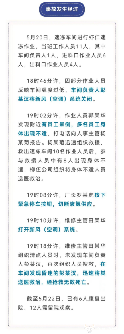 根据通报,2023年5月20日20时许,位于湖北省潜江市老新镇的新柳伍食品科技有限公司(以下简称新柳伍公司)发生一起氮气窒息事故,造成1人死亡18人受伤。5月20日,速冻车间进行虾仁速冻作业,18时46分许,因部分作业人员反映车间温度过低,车间负责人彭某汉将新风 (空调) 系统关闭。19时02分许,作业人员郭某华体出现不适,打电话向人事主管杨某菊报告。杨某菊迅速组织救援救出速冻车间10名作业人员后,参与救援人员中有8人出现身体不适,柳伍公司组织将身体不适人员送医救治。最后,彭某汉经抢救无效死亡。