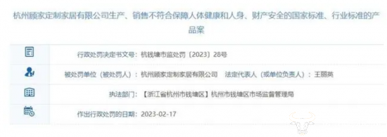 值得一提的是,近期,顾家家居子公司被罚了,2月17日,杭州市钱塘区市场监督管理局对杭州顾家定制家居有限公司进行了处罚。