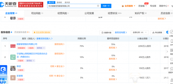 据天眼查显示,杭州顾家有四大股东,其中大股东是顾家家居股份有限公司,持有75%的股份。