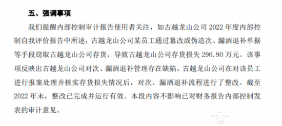 值得注意的是,在去年公司的内部控制审计报告中,天健会计师表示,提醒内部控制审计报告使用者关注公司2022年度内部控制自我评价报告中所述,公司某员工通过篡改或伪造次、漏酒退补单据等手段窃取古越龙山公司存货,导致古越龙山公司存货损失296.90万元。