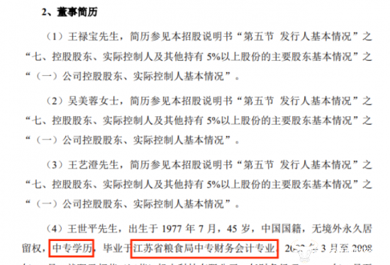 招股书显示,王世平出生于1977年,今年46岁,他是中专学历,毕业于江苏省粮食局中专财务会计专业。