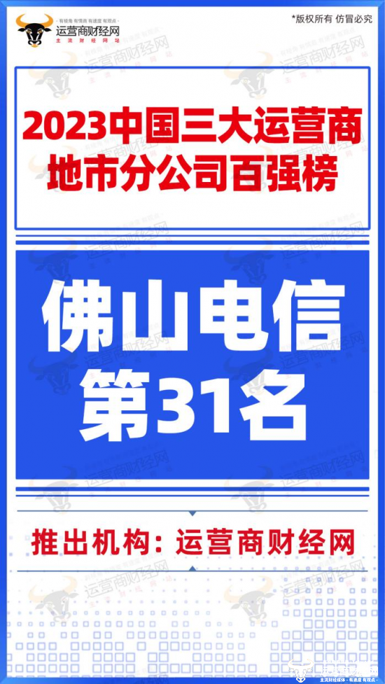 从运营商财经网推出的“2023中国电信地市分公司33强榜”中得知,佛山电信的营收规模位列中国电信地市分公司中第10名,而其在“2023三大运营商地市分公司百强榜”中位列第31名。