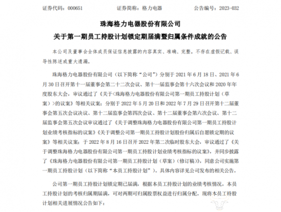 本月初,格力电器发布公告,称公司第一期员工持股计划锁定期已届满,根据本员工持股计划的业绩考核情况,本员工持股计划的考核归属期届满,可对两期可归属股票权益进行归属分配。不知王法雯会对名下持股如何分配呢?