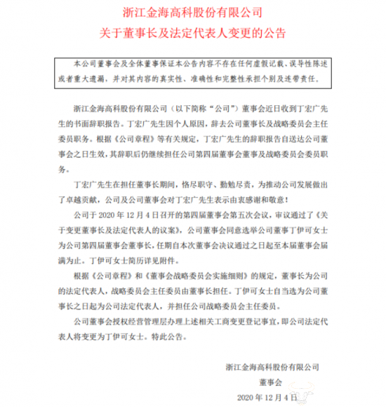 2016年初,丁伊可进入金海高科总裁办工作。2020年12月,金海高科原董事长丁宏广辞职并由丁伊可接任,而丁伊可其实是丁宏广的女儿,且丁宏广目前为金海高科的实际控制人。