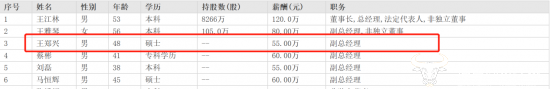 王郑兴的薪酬在高管中处于居中水平,他和刘磊一样都是55万元,在副总经理职务中是最低的。