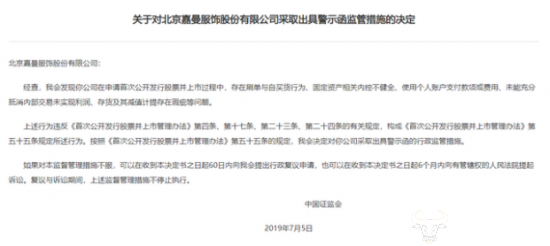 2018年,加曼服饰冲击资本市场,但在排队时被证监会查出“存在刷单与自买货行为、固定资产相关内控不健全”等问题。此后,证监会于2019年7月对加曼服饰出具警示函。