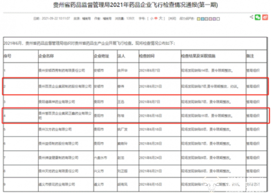 2021年6月,贵州省药品监督管理局对贵州省药品生茶企业开展飞行检查,贵州百灵企业集团现场发现缺陷7项,旗下正鑫药业发现缺陷11项。对此,贵州省药品监督管理局责令其限期整改,并对贵州百灵进行了约谈。