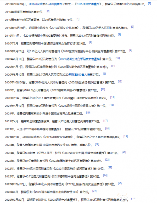 但程雪的财富可远不止这些,据百度百科显示,程雪是富豪榜单上的常客,光是从2015年到现在,她的各类上榜记录就有26条。最新一条是,2023年3月23日,胡润研究院发布《2023胡润全球富豪榜》,程雪以460亿元财富位列榜单第395位。