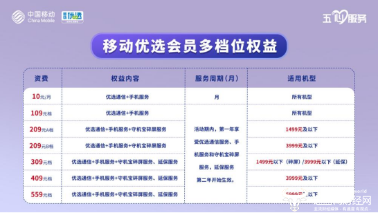 第二步,了解、挑选适合你的一档会员权益。“移动优选会员”分为10元/月、109元档、209元A档、209元B档等7个档位,针对不同档位和适用机型,匹配最优的会员权益。