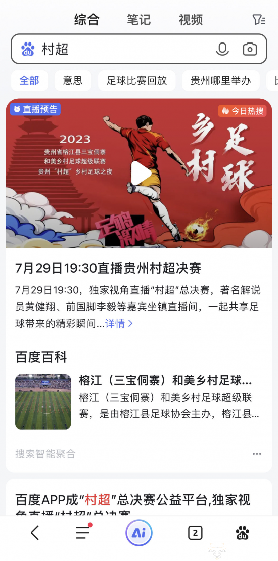 据悉,百度APP成为此次“村超”总决赛公益传播平台,将用独特视角直播“村超”总决赛,用户可以在百度APP上搜索“村超”,一键预约直播。百度APP将邀请著名解说员黄健翔、前国脚李毅等嘉宾坐镇百度直播间,与百度用户一起共享足球带来的精彩瞬间。