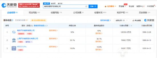 依维柯和上汽有什么关系呢?天眼查APP显示,上海汽车集团股份有限公司持有南京依维柯汽车有限公司30.1%的股份。