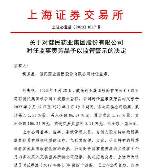 值得注意的是,就在前不久,健民集团因职工代表监事黄芳晶亲属短线交易,引发相关舆情。