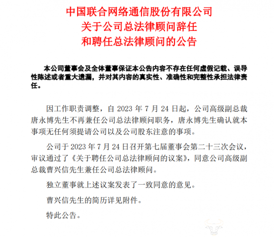 近日,中国联通发布了关于公司总法律顾问辞任和聘任总法律顾问的公告,因工作职责调整,自2023年7月24日起,公司高级副总裁唐永博先生不再兼任公司总法律顾问职务。同时,同意公司高级副总裁曹兴信先生兼任公司总法律顾问。