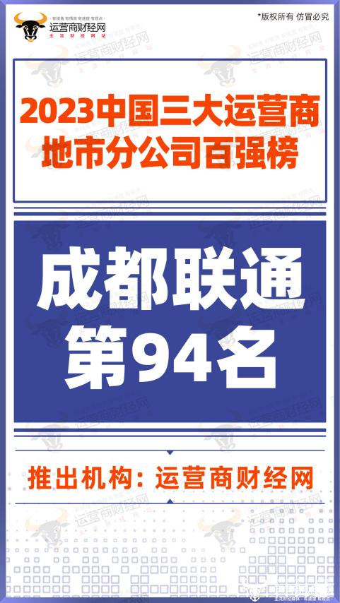 在运营商财经网独家推出的“2023中国联通地市分公司33强榜”中,成都联通位列榜单的第14名;而在“2023三大运营商地市分公司百强榜”中位列第94名。