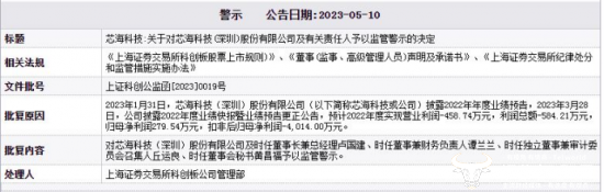 值得一提的是,在2023年5月10日,因芯海科技在2023年1月31日披露2022年年度业绩预告后,又在2023年3月28日披露2022年度业绩快报暨业绩预告更正公告等业绩预告不准确等行为收到上海证券交易所科创板公司管理部警示。