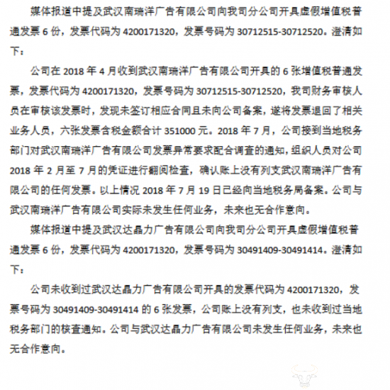 同时,公司未收到与武汉达晶力广告有关的6份增值税普通发票,且未收到过当地税务部门的核查通知。