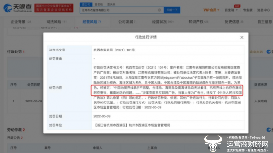 据天眼查有关此事的行政处罚信息显示,此次具体事由为,“经鉴定该公司官网子页面展示的地图图片中,中国地图界线表示不完整,台湾岛、海南岛及南海诸岛均无法看清,已有界线上也存在漏绘阿克赛钦、藏南地区的问题。涉案页面系互联网广告,当事人作为广告主,违反了相关法律。”