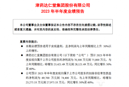 据悉,达仁堂今年半年度预计实现归属于上市公司股东的净利润为7.03亿元到7.5亿元,同比增长50%至60%;预计实现归属于上市公司股东的扣除非经常性损益的净利润约6.97亿元到7.44亿元,同比增长50%至60%。