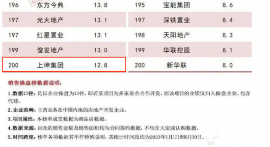 据悉,在克尔瑞发布的《2023年1-6月房地产企业操盘榜TOP200》中,上坤集团以12.8亿的操盘金额位列第200位,即将跌出榜单。种种信息都显示上坤地产上半年的业绩令人担忧,运营商财经网试图进一步揭秘。