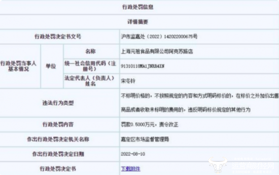 值得注意的是,在去年8月,上海元祖食品有限公司阿克苏路店受到了来自上海市市场监督管理局的行政处罚。违法类型是该门店存在不标明价格,不按照规定的内容和方式明码标价的,在标价之外加价出售商品或者收取未标明的费用的,违反明码标价规定的其他违法行为,监管局责令当事人立即改正违法行为,并罚款5000元。