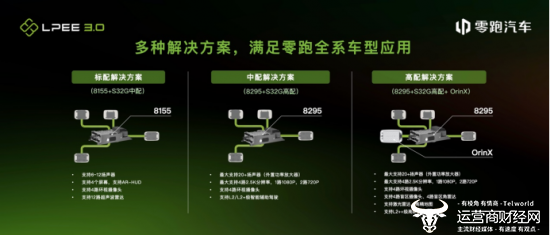 发布会上,零跑电子电气模块负责人周徐宁表示,【四叶草】架构通用化率大于90%,并推出标配、中配、高配三种配置可选,全面应用于10~30万级车型;其中标配采用高通8155(第三代骁龙座舱平台)+S32G的方案,中配采用高通8295(第四代骁龙座舱平台)+S32G的方案,高配采用高通8295(第四代骁龙座舱平台)+S32G高配+高阶Orin-X,并支持L2++级高阶智能辅助驾驶功能。