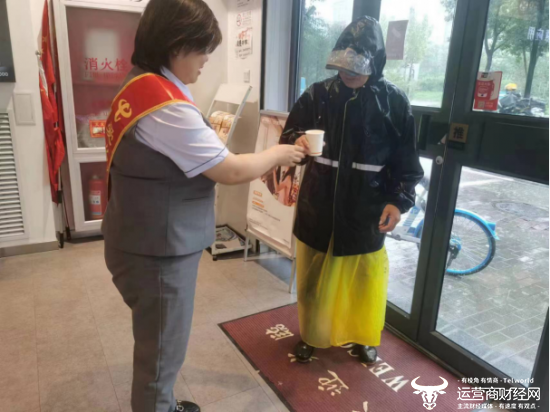 7月30日,北京电信营业厅爱心专员邀请环卫工人进厅避雨,并递上热水。