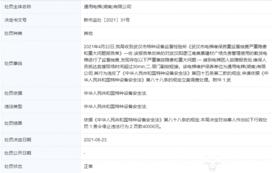 值得一提的是,就在2021年,通用电梯的湖南分公司因为公司产品存在以下严重事故隐患和重大问题:一.接到电梯困人故障报告后,维保人员抵达救援现场时间超过30min;二.层门副锁短接。故被行政处罚了4万元。
