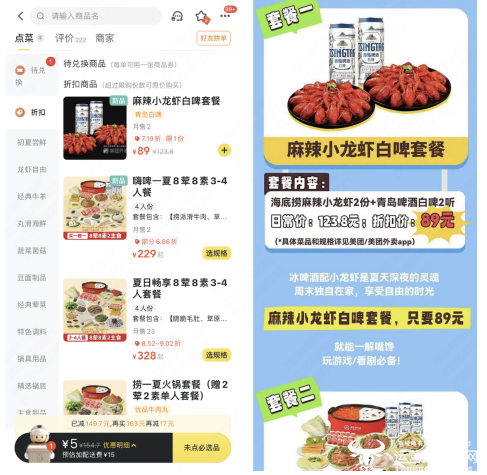 在选品方面,曾获“2019年世界啤酒锦标赛银奖”的高品质青岛啤酒白啤与海底捞火锅、夏季爆款小龙虾产品,在消费场景和用户人群方面深度契合,双方推出两款定制外卖套餐——“麻辣小龙虾白啤套餐”和“嗨啤一夏8荤8素套餐”,前者定位于用夏季限定爆品制造爆点,后者则意在用高性价比吸引有聚会需求的用户群体。