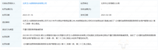 但值得注意的是,在今年1月,顺义分局警务支援大队民警对北京王小卤网络科技有限公司检查时,发现该单位网站不履行国际联网备案职责。违反了《计算机信息网络国际联网安全保护管理办法》第十二条第一款、第二十三条之规定,决定给予该公司警告的处罚。
