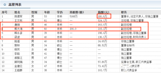 值得一提的是,东方财富网信息显示,熊大海去年获得的薪酬为215.2万元,这个薪酬非常不错,在公司四位副总中,他的薪酬是最高的,甚至比公司董事长陈德军的年薪还高出不少。陈德军的薪酬为180.6万元,熊大海的年薪比他高出将近35万。