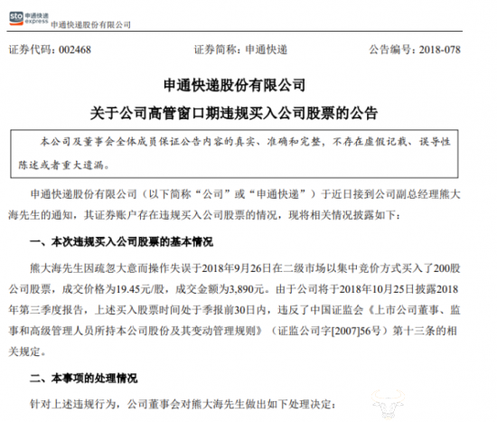 当时,由于申通快递将于2018年10月25日披露2018年第三季度报告,上述买入股票时间处于季报前30日内,熊大海的行为属于窗口期违规买入公司股票。对此,申通快递对熊大海进行了批评教育,熊大海承诺未来如出售该部分股票,所有收益归上市公司所有。