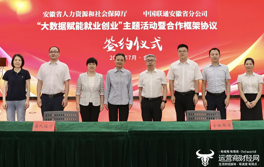近日,安徽联通与安徽省人力资源和社会保障厅共同举办了手机大数据赋能就业创业主题活动暨合作框架协议签约仪式。安徽联通总经理韩冰及副总经理杜鹏出席活动仪式。