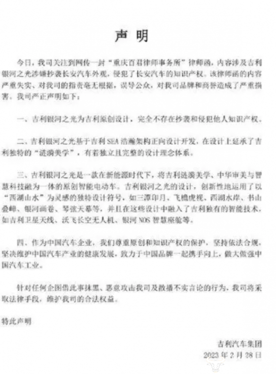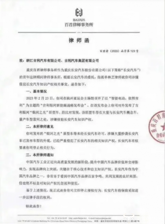 今年2月,一封由重庆百君律师事务所发布的律师函称:吉利银河“银河之光”原型车存在大量与长安汽车概念车,量产车型雷同之处,涉嫌侵犯长安汽车知识产权。
