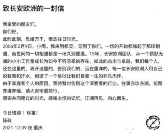 2021年12月,陈政发布了一封辞职信,表示“由于家庭和个人原因,我将暂时告别这个深爱着的行业。”媒体资料披露,陈政辞职时的身份是长安汽车集团全球设计总监、首席品牌运营官、长安欧洲设计中心董事长、长安汽车品牌公关部总经理、新闻发言人。