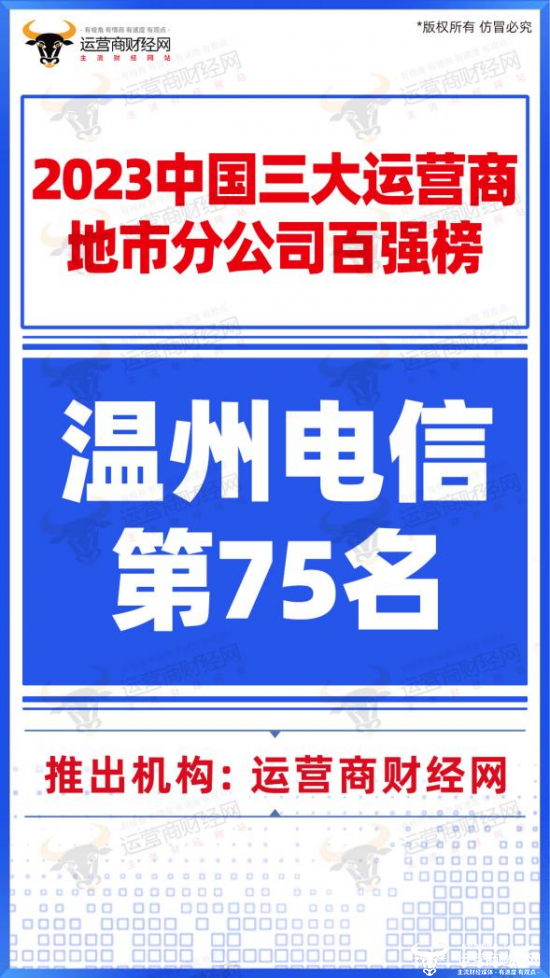 据悉,在运营商财经网以营收规模为客观依据而推出的“2023中国电信地市分公司33强榜”中,温州电信高居第17名。