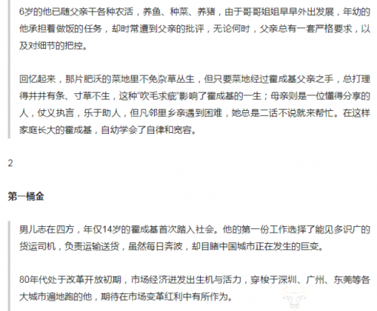 2018年,中陶城集团联合中洁网深入访谈了三十个卫浴行业的人物,其中在《霍成基:中国浪鲸的逐浪前行》这篇访谈中写到,由于家庭困难,霍成基的学历不高,从小干各种农活,14岁就开始当货运司机负责运输送货。