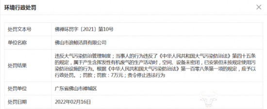 值得关注的是,在去年年初,浪鲸公司因为环保问题被罚款了7万元。