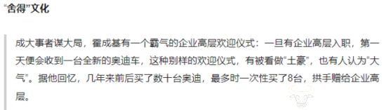 值得一提的是,霍成基曾在采访中说到浪鲸有一个奢侈的企业高层欢迎仪式:一旦有企业高层入职,第一天便会收到一台全新的奥迪车。不知这是真的吗?