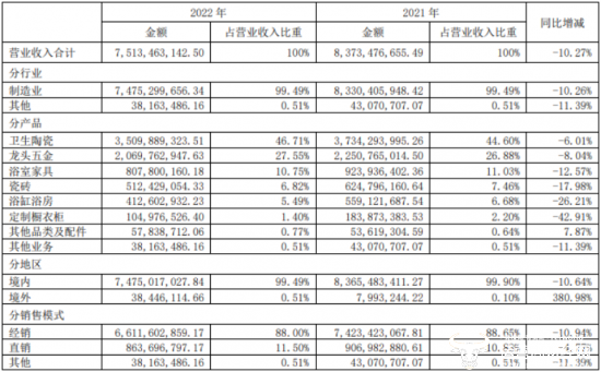 去年12月,箭牌家居成功上市。但在上市首年,箭牌的发展却出现了退步,公司2022年总营收为75.13亿元,同比下降10.3%;旗下的卫生陶瓷、龙头五金、浴室家具、瓷砖、浴缸浴房、定制橱衣柜等产品营收全线下滑,分别同比下降了6.01%、8.04%、12.57%、17.98%、26.21%、42.91%。