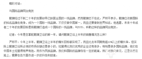 当年,严邦平曾在采访中表示,“未来十年或者二十年的发展目标是将箭牌打造成一个国际的一线品牌,与TOTO、科勒这样的品牌同台竞技”。