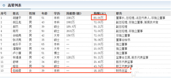 值得一提的是,东方财富网信息显示,去年10月底刚上任的伍晓君获得的薪酬为18.18万元,从她的上任时间来看,这个薪酬还可以。在整个公司高管团队中,薪酬普遍不高,公司董事长、总经理胡建平的薪酬是80万元,在高管团队中最高。