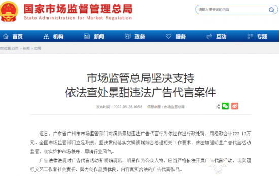 值得一提的是,就在去年,晾霸的代言人,演员景甜因为违法广告代言行为被广东省广州市市场监管部门依法作出行政处罚,罚款合计722.12万元。