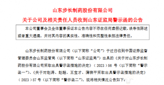 根据步长制药发布的公告显示,公司存在以前年度商誉减值损失计提不准确、信息披露不及时的问题。山东证监局确认公司相关人员赵涛、赵超、王宝才对上述问题负主要责任,因此对其采取出具警示函的监督管理措施,并记入证券期货市场诚信档案数据库。