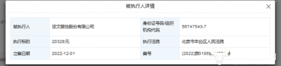 值得注意的是,据天眼查信息显示,自2022年起,依文服饰涉及相关案件达15例。其中,2022年12月1日,依文服饰被北京市丰台区人民法院列为首次执行被执行人,执行标的20328元,相关案号为(2022)京0106执14091号。这点钱倒是不多,不知为何会到这个地步。