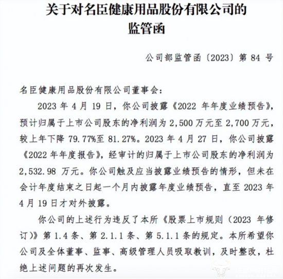 监管函指出,2023年4月19日,名臣健康披露的《2022年年度业绩预告》,预计归属于上市公司股东的净利润为2500万元至2700万元,较上年同期下降79.77%至81.27%。但公司于4月27日披露《2022年年度报告》,归属于上市公司股东的净利润为2531.98万元,触及应当披露业绩语法的情形,但未在会计年度结束之日起一个月内披露,违反相关规定。