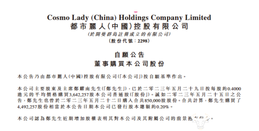 5月31日,公司发布公告称,公司主要股东及主席郑耀楠,已于2023年5月29日按每股约0.4港元的平均价格购买约364.23万股公司普通股。而在此之前的5月22日,郑耀楠也曾购入85万股公司股份。两次增持合计共449.23万股,总计增持股份约0.2%。