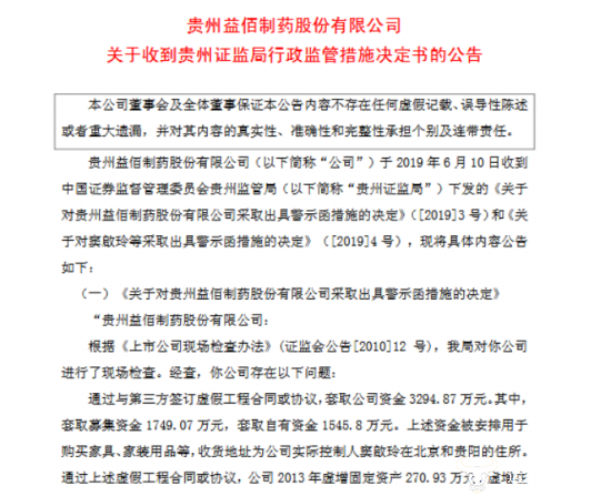 据益佰制药2019年12月16日发布的公告称,于近日收到中国证券监督管理委员会贵州监管局下发的《关于对贵州益佰制药股份有限公司采取出具警示函措施的决定》和《关于对窦啟玲等采取出具警示函措施的决定》。