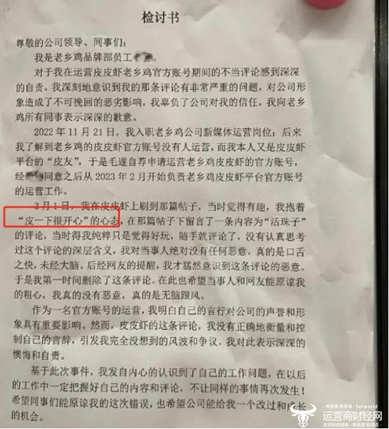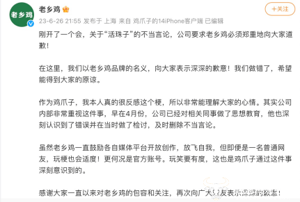 近期,老乡鸡因发表“活珠子”的不当言论向公众发表致歉并上传检讨书,此事引发大众热议。